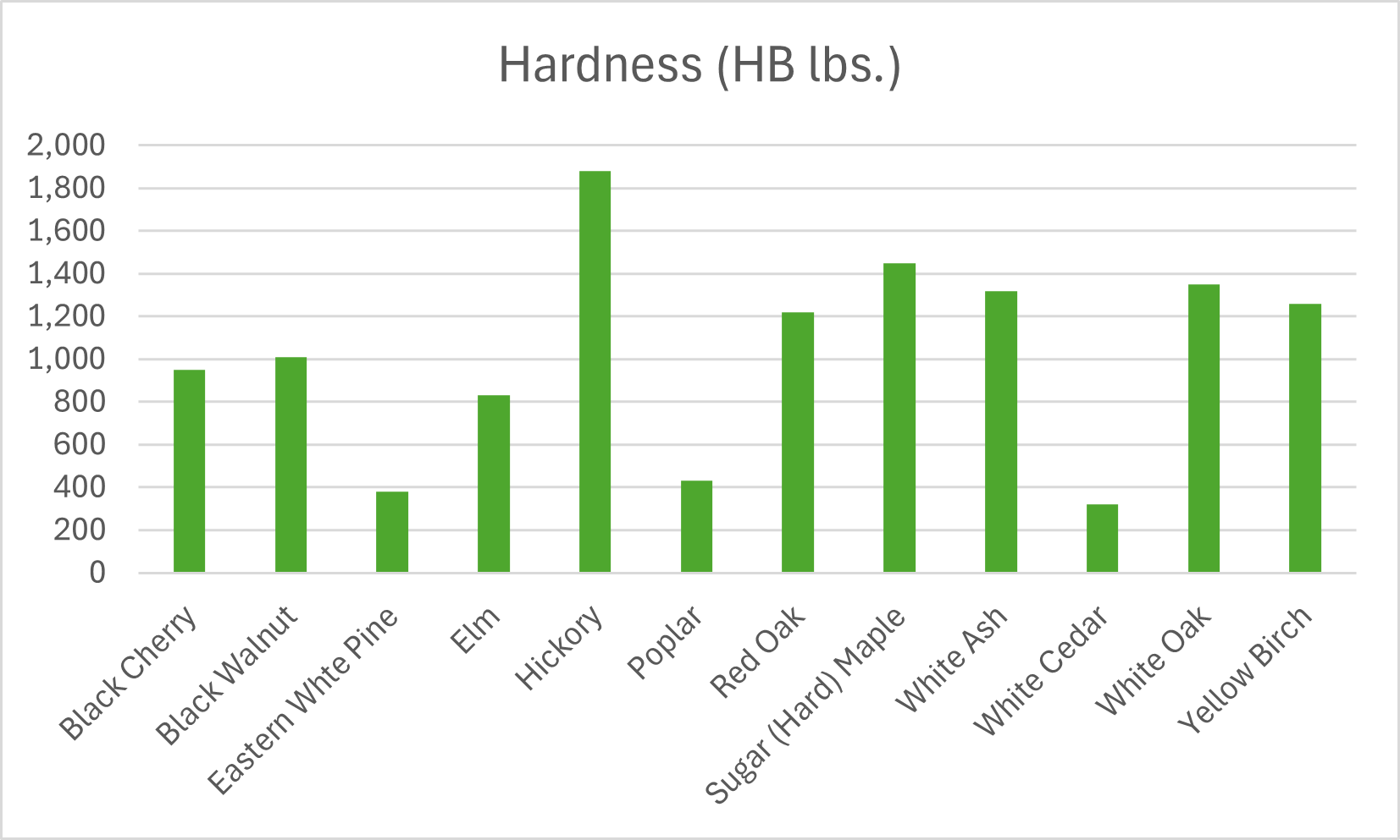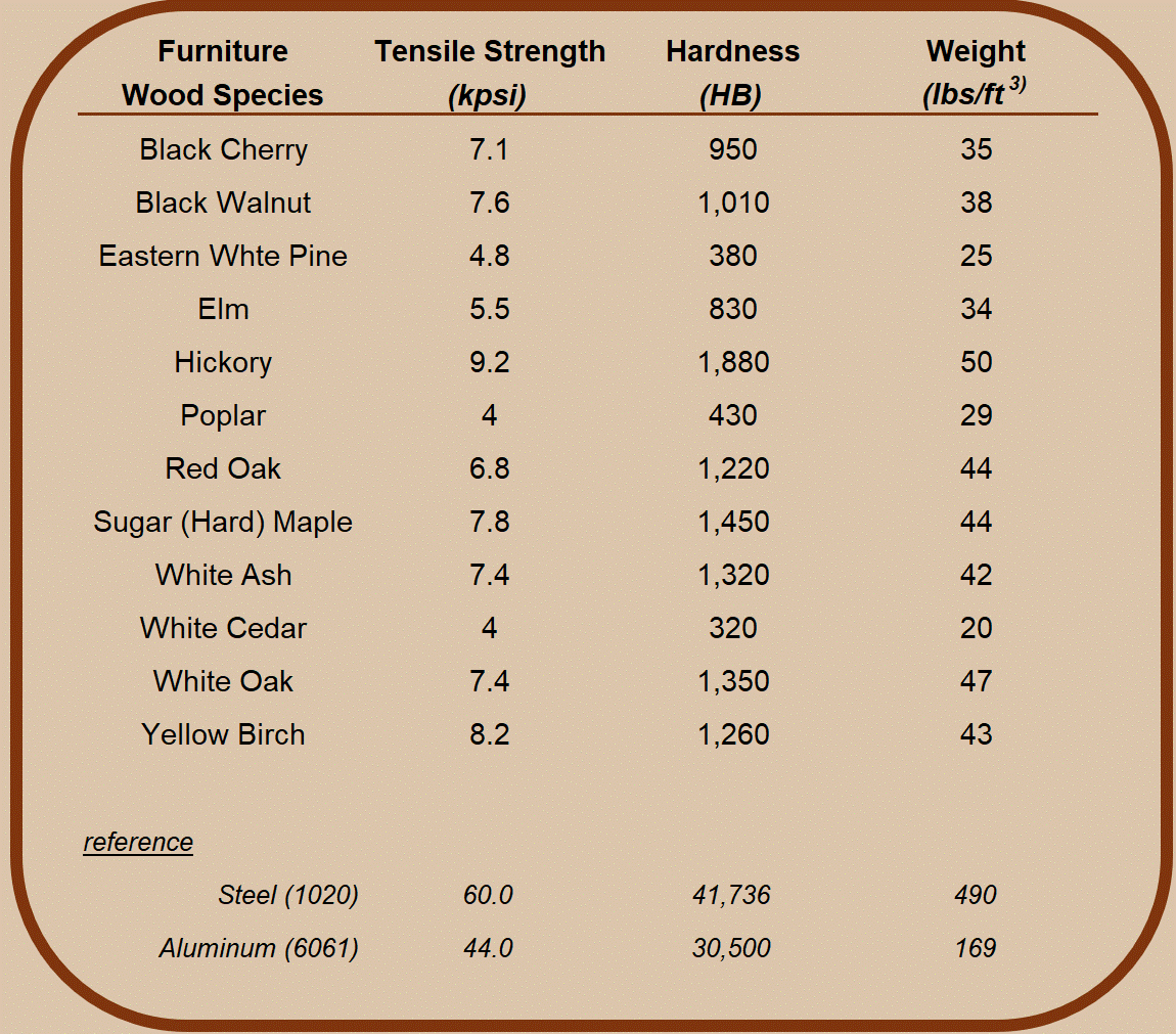 Tensile Strength indicates a material’s resistance to bending and breaking (higher number equals stronger). Hardness measures a material’s resistance to denting (higher number equals more dent resistance). Density is a materials weight per volume (higher density means heavier wood).